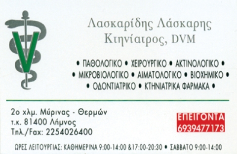 Κτηνιατρική κλινική μικρών & μεγάλων ζώωνΑιματολογικές - βιοχημικές - ακτινολογικές χειρουργικές εξετάσειςΤροφές - εμβόλια - φάρμακα - αξεσουάρΚαθημερινά πρωί - απόγευμα εκτός Δευτέρας απογεύματος