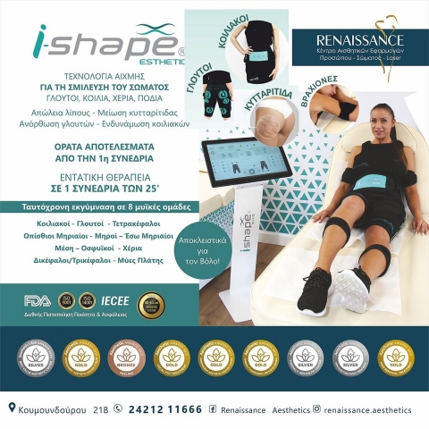 BEST INDEPENDENT AESTHETIC CENTER Rest of Greece/Volos - 2023 Για άλλη μια χρονιά, το κέντρο αισθητικής Renaissance Aesthetics διακρίθηκε με το πανελλήνιο Χρυσό Βραβείο στην κατηγορία: Independent Aesthetic Center - Rest of Greece/Volos για το 2023. Επιπλέον, απέσπασε ξεχωριστή διάκριση για την υπηρεσία LOCAL FAT TREATMENT: Πανελλήνιο Χρυσό βραβείο για το 2023